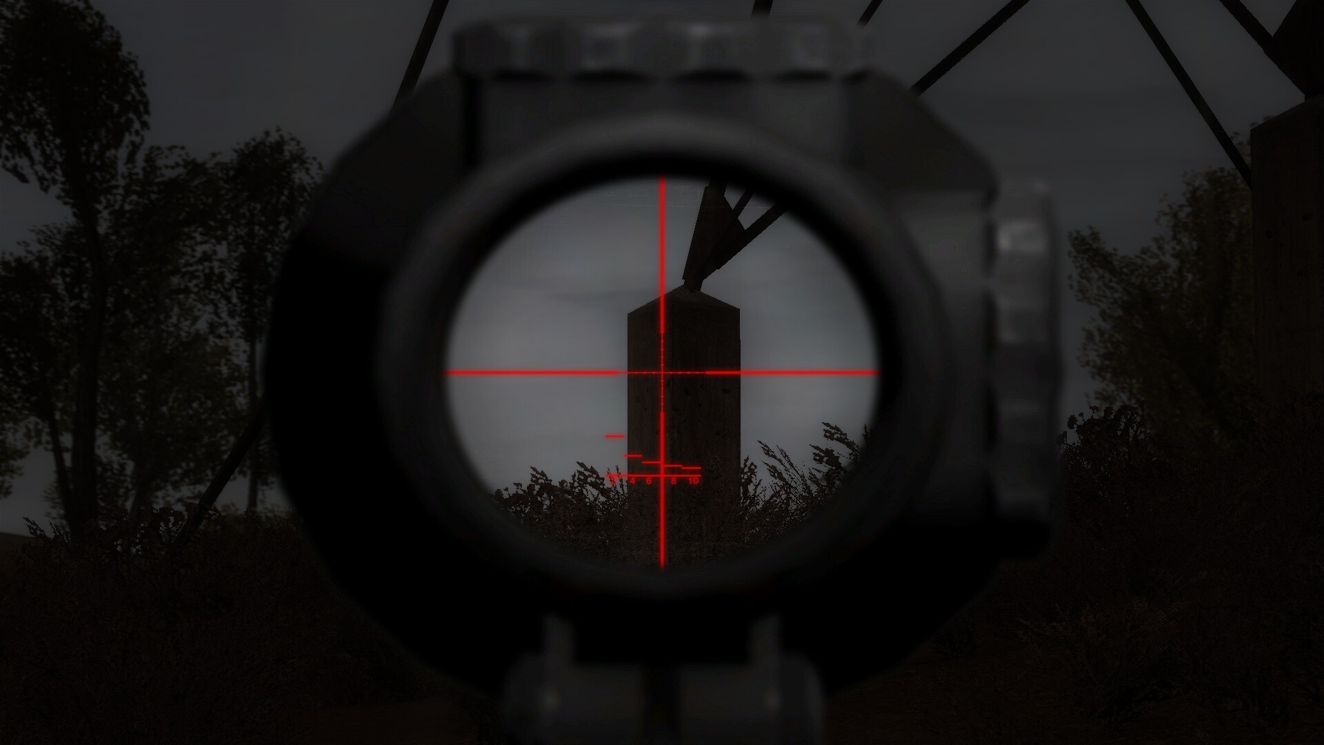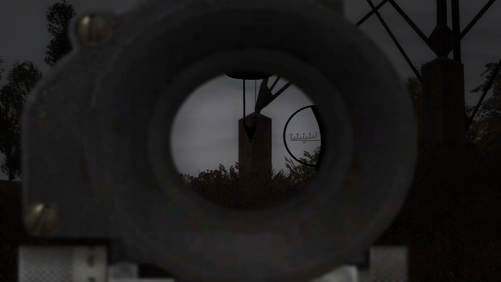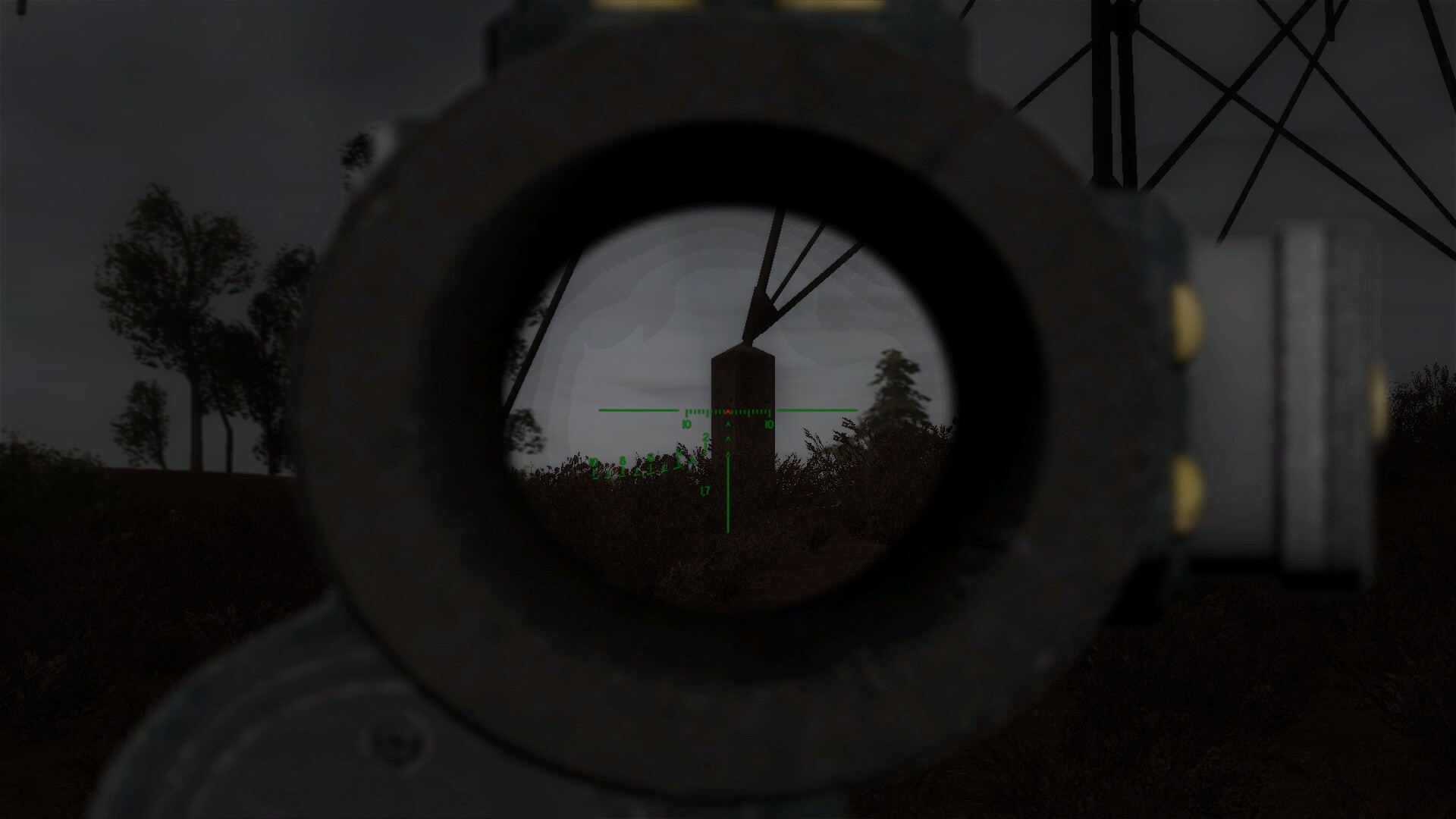 Zmiana parametrów x, y i powiększenia nic nie daje. Przy takim ustawieniu pocisk przelatuje nad widocznym w oddali ogrodzeniem.