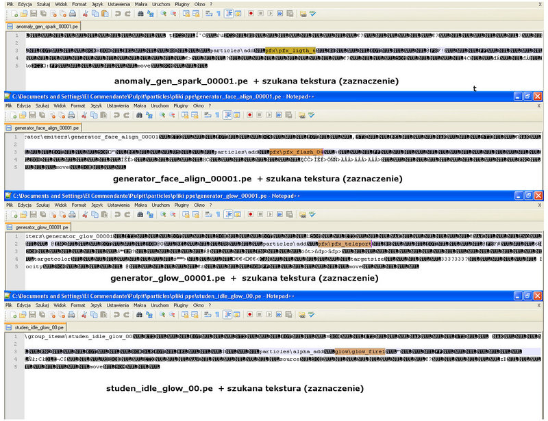 Edycja plików **Notepad'em** [](https://attachments.stalkerteam.pl/monthly_06_2013/post-3466-0-63121900-1370537262.jpeg) Screen przedstawia powiązanie plików z pkt. 6 z teksturami: (występują 4 wpisy, ponieważ zgodnie z tym na co zwracałem uwagę w zespojlowanym tekście). Pomimo, iż większość plików jest już w oryginale, warto wiedzieć w jaki sposób szukać tekstur do uzyskania żądanego efektu wizualnego. - Ostatnia czynność, otwieramy plik textures.ltx [gamedatatextures] i dodajemy teksturę, której brakowało czyli z Solijanki kopiuję sekcję: