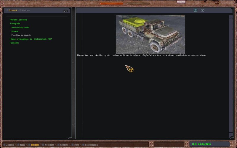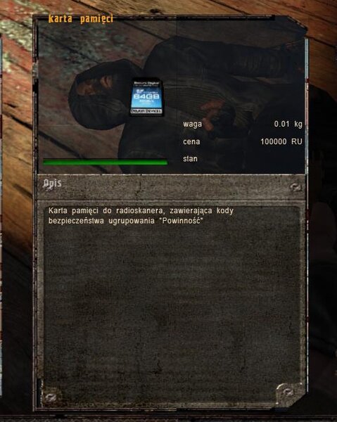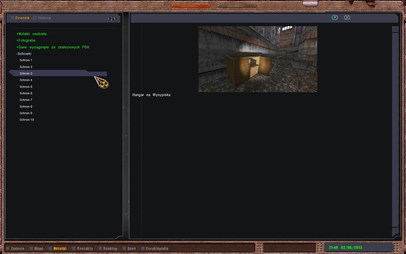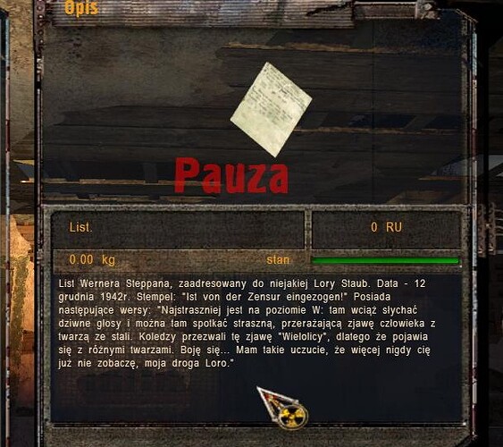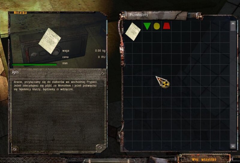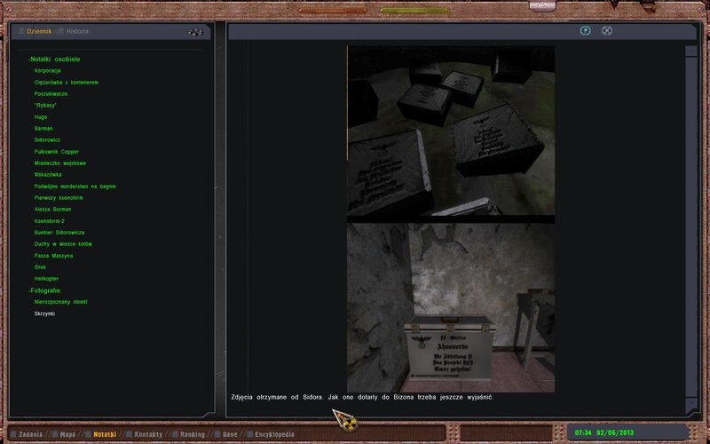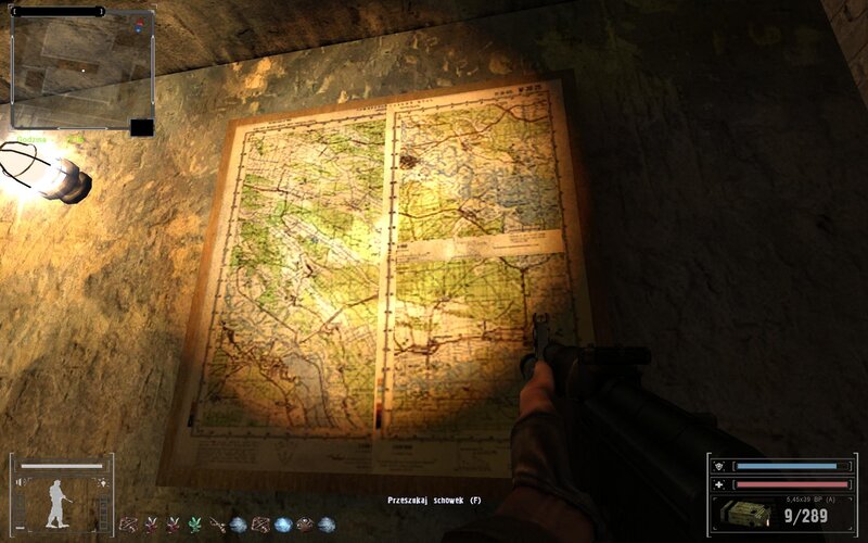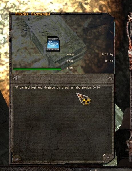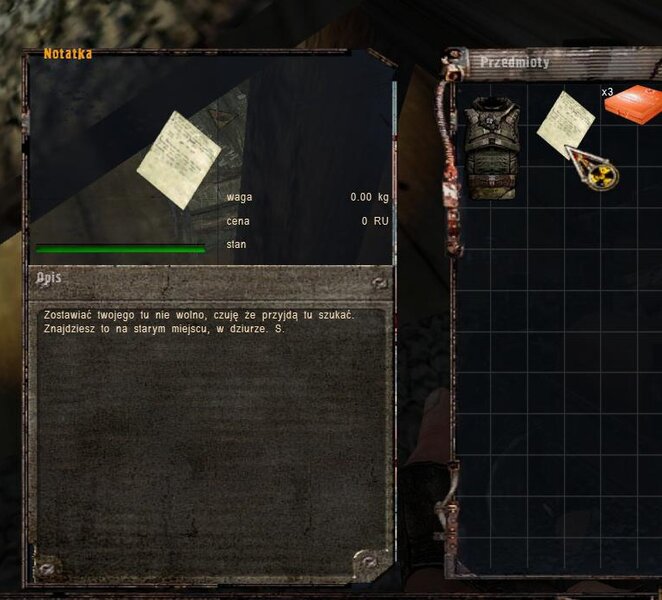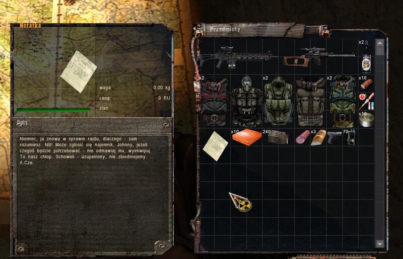 . Czytamy notatkę. W schowku Dziadka Szczukara na stryszku znajdujemy kolejną. Na mapie zaznacza nam 6 schowków. Najważniejszy jest ten w którym w Narodnej Soliance siedziała Mucha. Tam znajdujemy kartę do drzwi w labie X-10 i notatkę.
