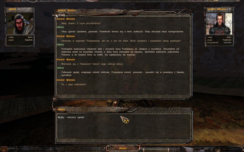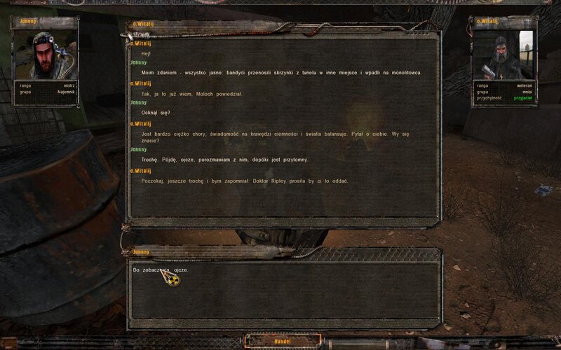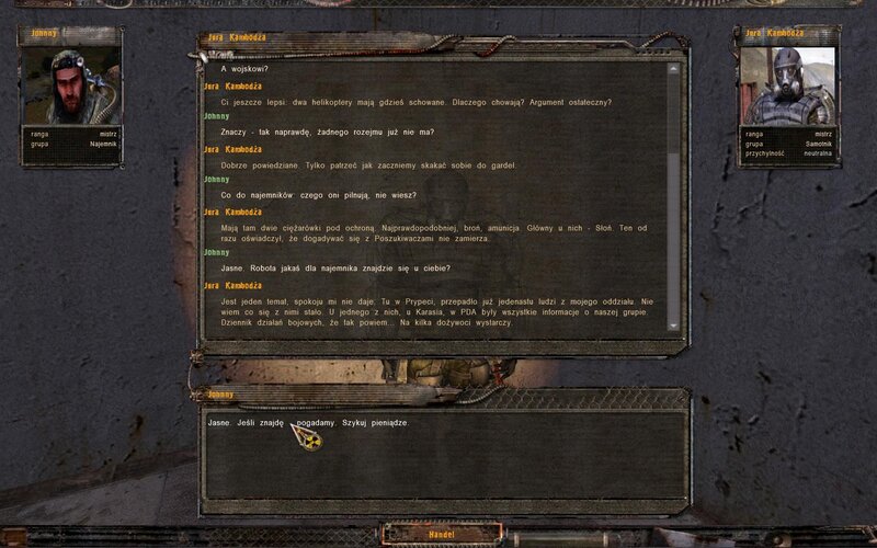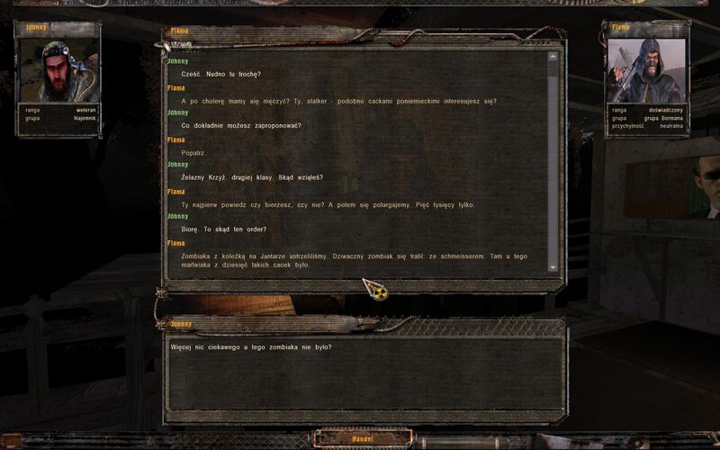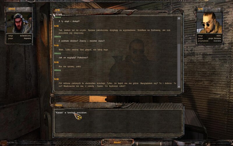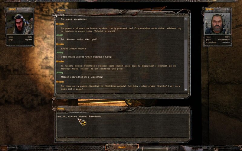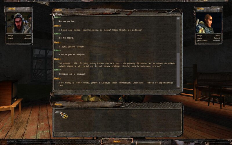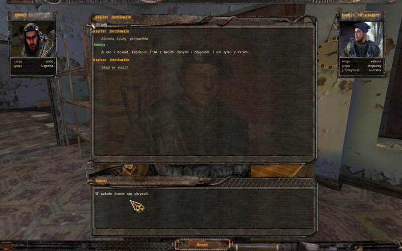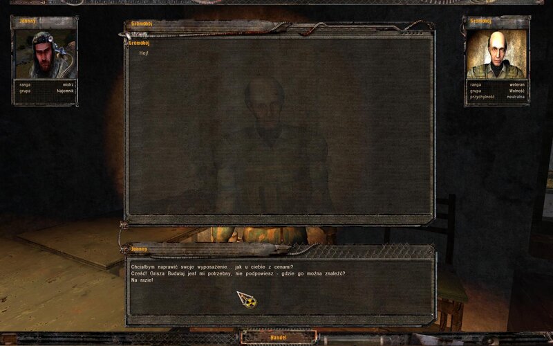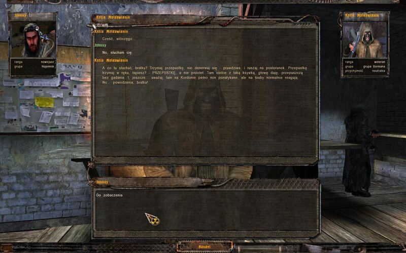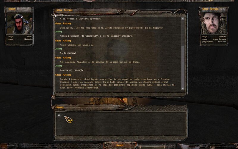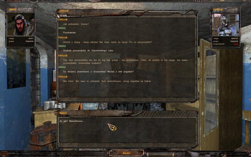 Po tym podchodzimy do stalkera na środku kantyny - Niemowy - on daje nam namiar na Goszę na Dzikim Wysypisku. Idziemy jeszcze do Wasilija.