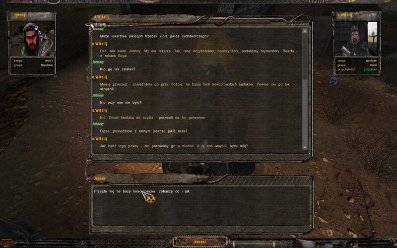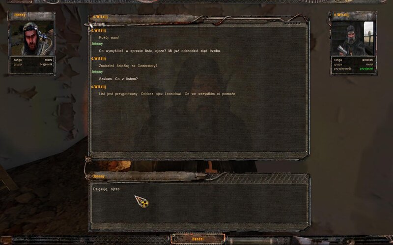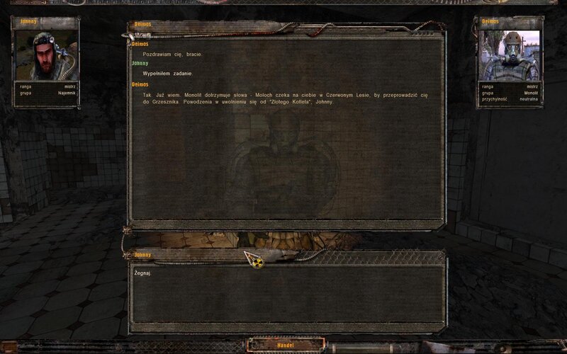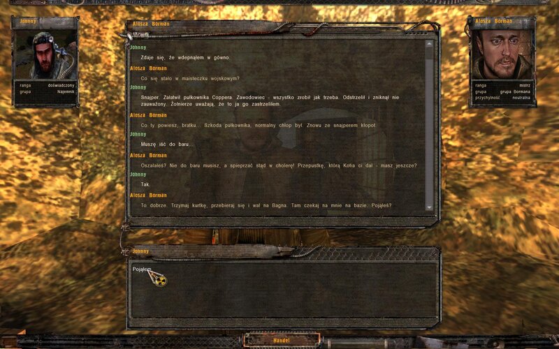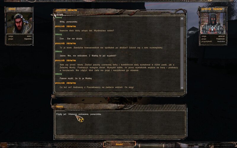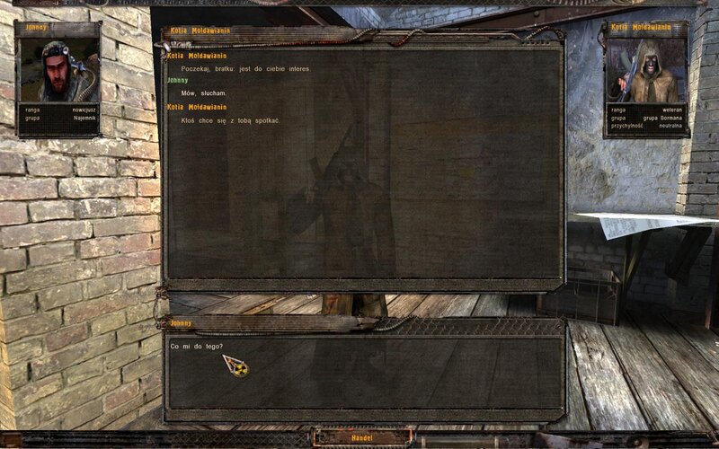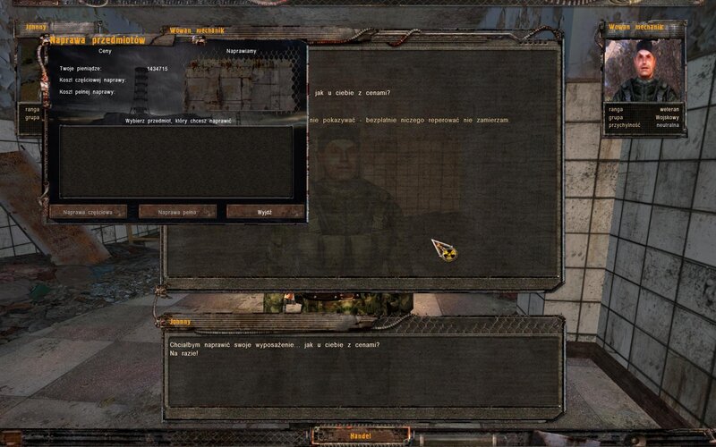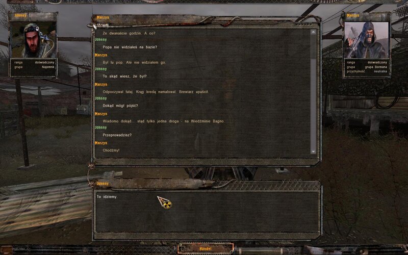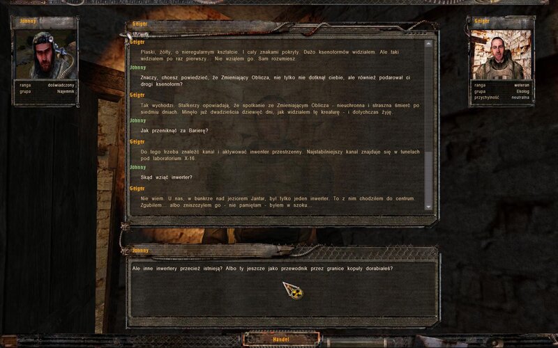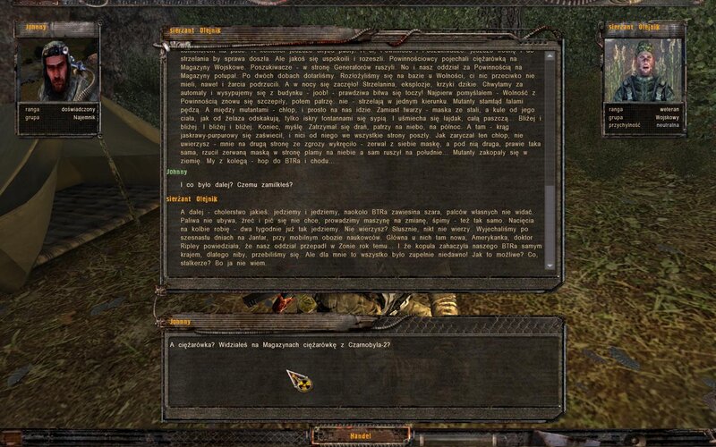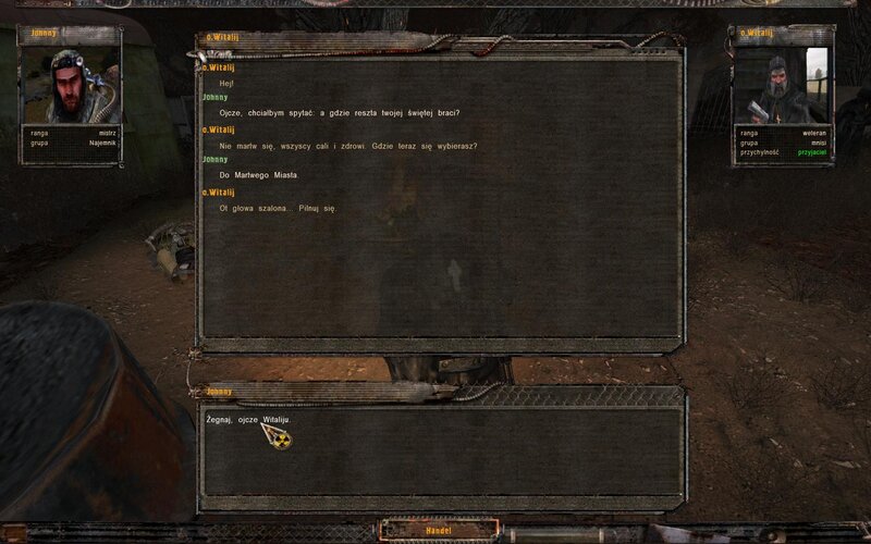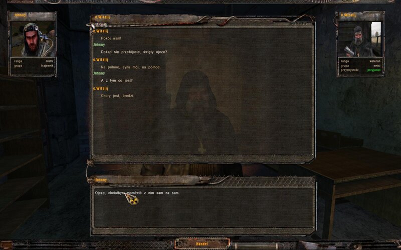 Po tym podchodzimy do stalkera na środku kantyny - Niemowy - on daje nam namiar na Goszę na Dzikim Wysypisku. Idziemy jeszcze do Wasilija.