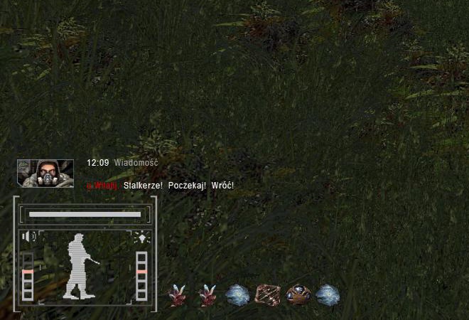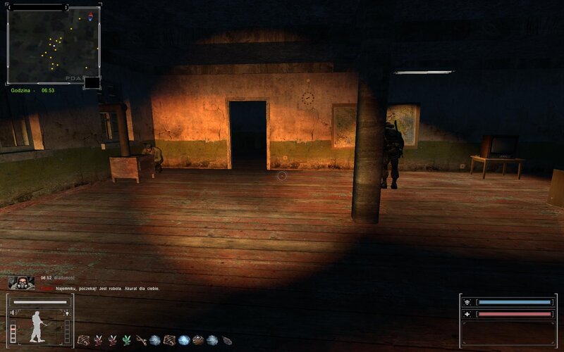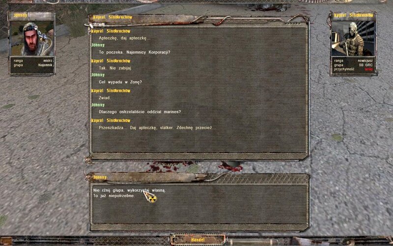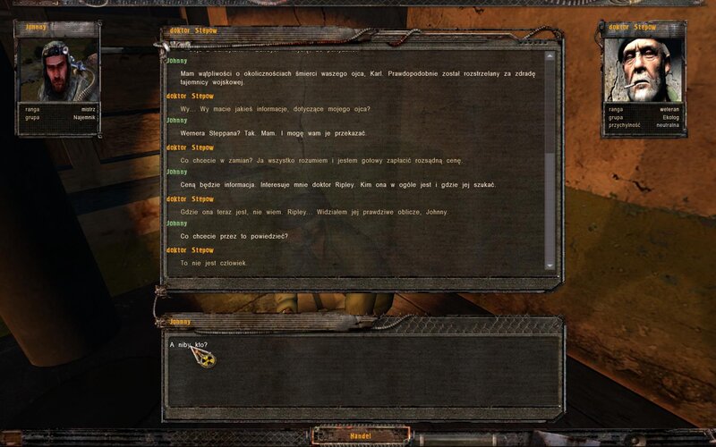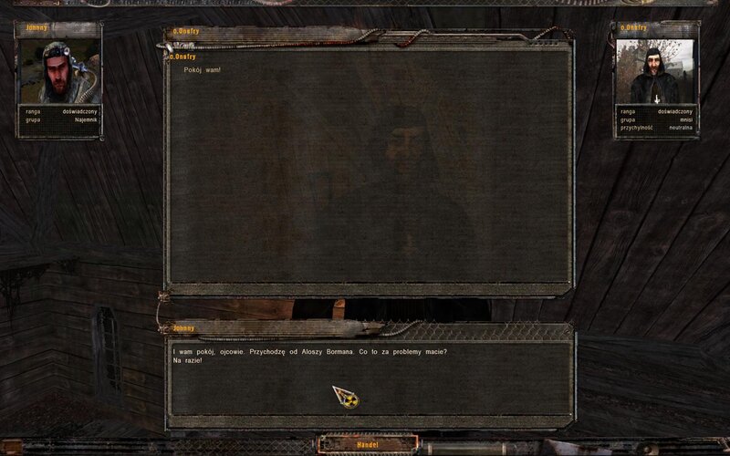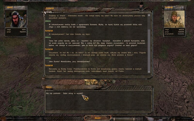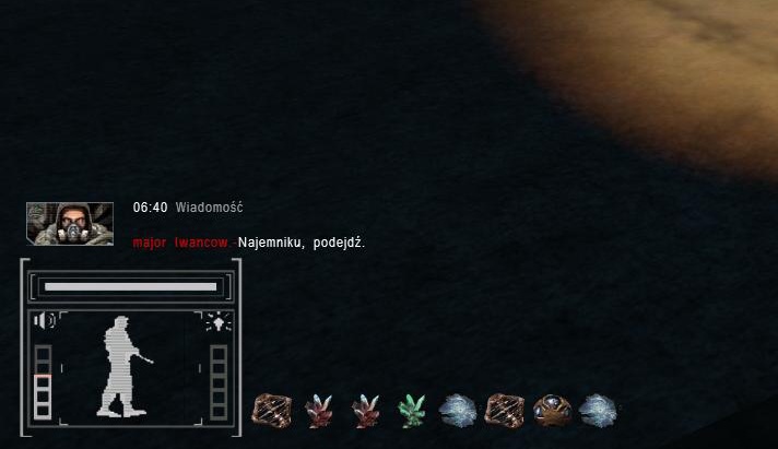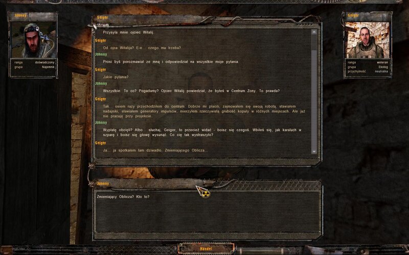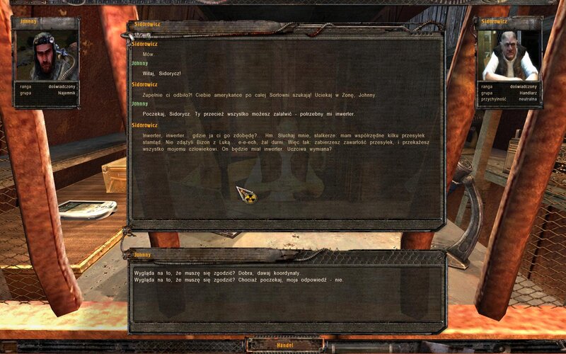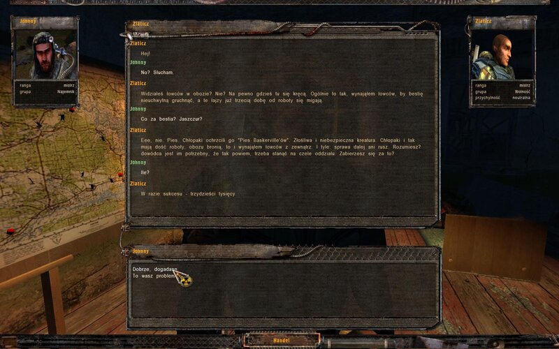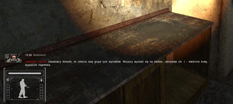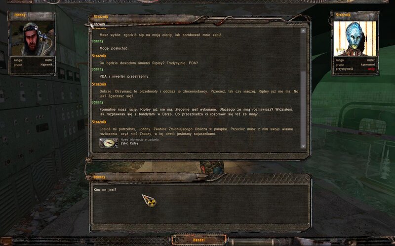Po tym podchodzimy do stalkera na środku kantyny - Niemowy - on daje nam namiar na Goszę na Dzikim Wysypisku. Idziemy jeszcze do Wasilija.