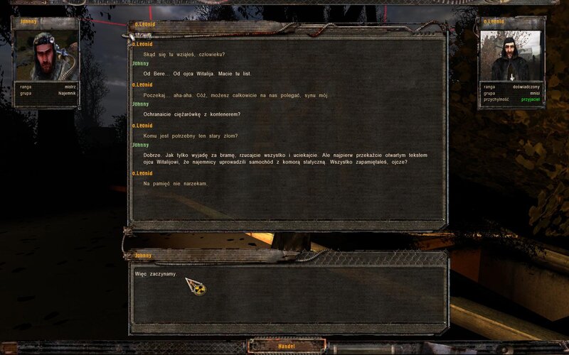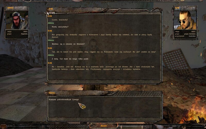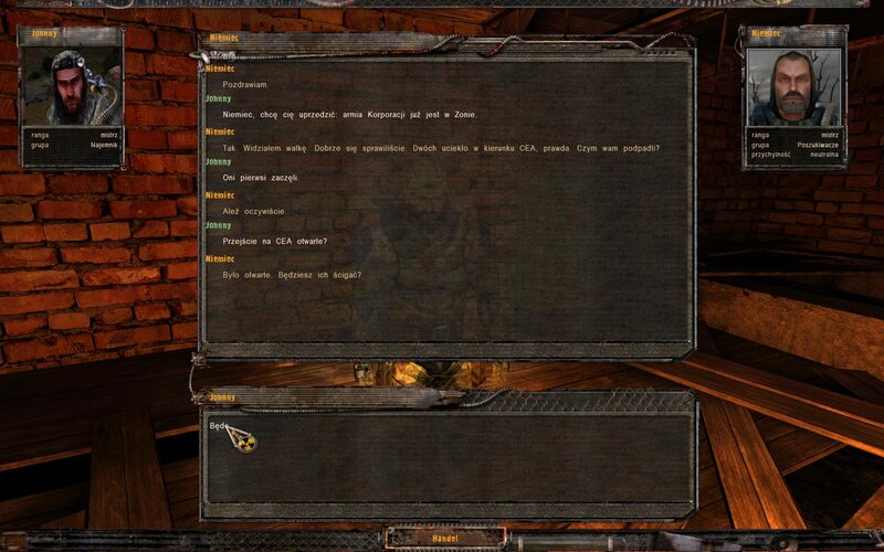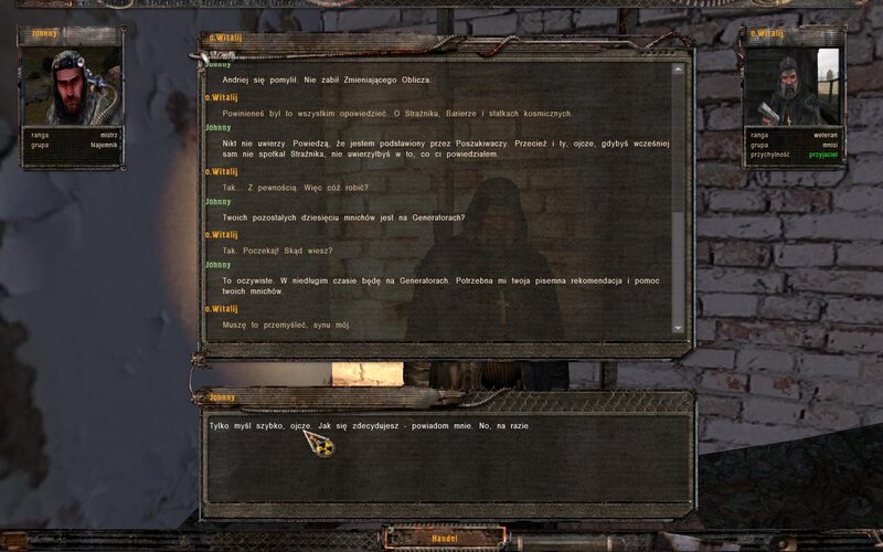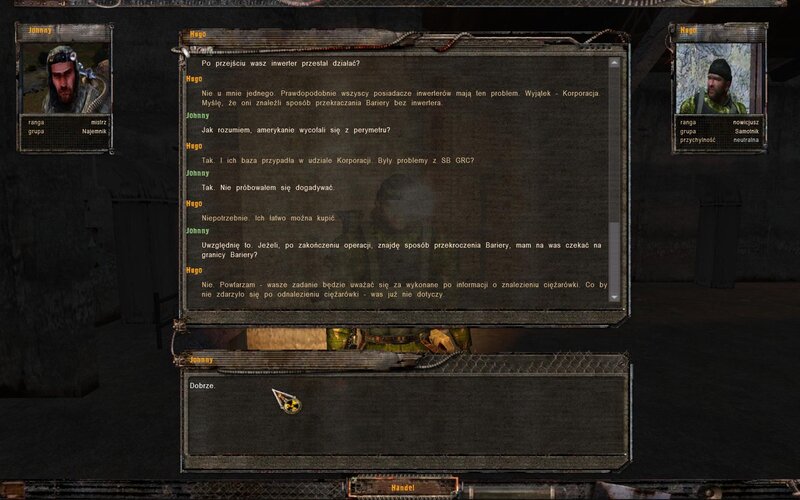 Po zastosowaniu metody Kondotiera udało mi się zaliczyć powyższe zadanie. Wracamy do Niemca i mamy dialog, że na kogoś czeka i ,że mamy iść. Wychodzimy prawymi drzwiami jak na screenie - inaczej zadanie nie zaskoczy. Obserwujemy co się dzieje. Ciekawa rozmowa o układzie , o walce o generatory, o najemnikach i bandytach.