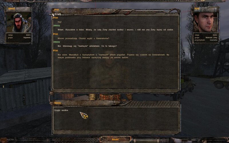 Rozmawiamy z Jermołem - bierzemy zadanie na 27 artów z zombi (nie ukończyłem tego zadania - brak mi 2 zombi - nie mogę ich znaleźć - po ukończeniu moda cofnę się w zapisach i uzupełnię o ten wątek poradnik). Dzięki radzie kolegi Apg2312 - doradził mi bym skorzystał z lornetki do namierzenia żywych celów odnalazłem 2 brakujące sztuki. Wróciłem do Jermoła. Mamy 2 opcję dialogowe - pierwsza kieruje nas na poszukanie info o artach, druga - spotkanie ze Striełokiem - druga opcja prowadzi donikąd (prawdopodobnie wyjdzie jakaś dopa bo kilka zadań jest jakby niedokończonych). Rozmawiamy z ludźmi w bazie i trafiamy na Pilota - ten odsyła nas do Synoptyka - jest on w okolicy betonki przy szlabanie. Od niego dowiadujemy się o pochodzeniu artów.