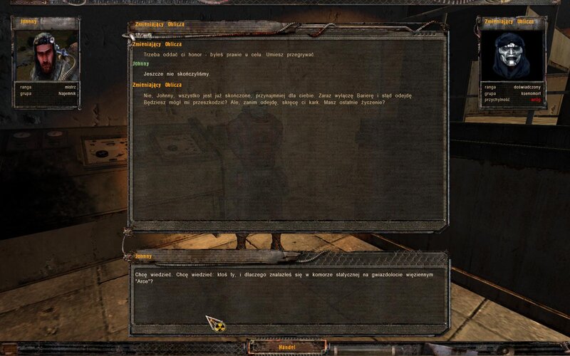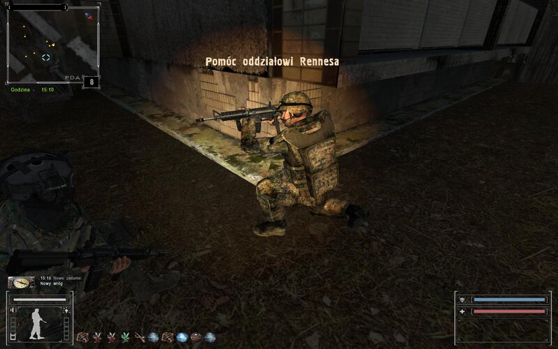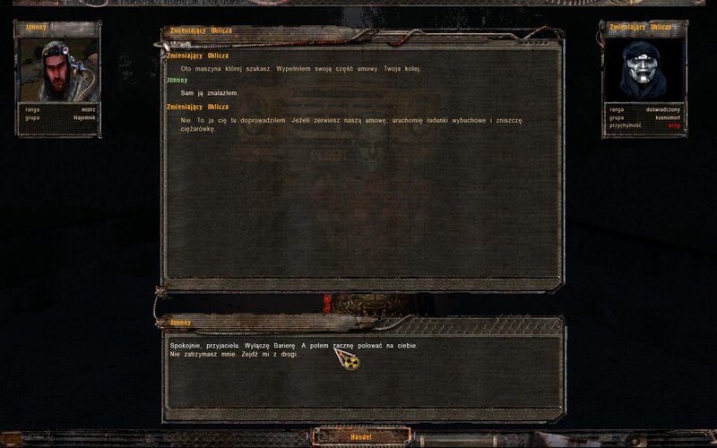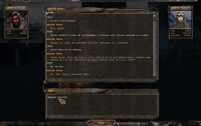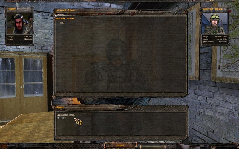 Wykonujemy zadanie. W nagrodę dostajemy order. Wracamy do Baru - tam spotykamy Zmieniającego Oblicza pod postacią Sida. Ruszamy do Goszy Rzezanego. Dostajemy namiar na Magazyny Wojskowe. Tam natykamy się na martwego Brednia. Zabieramy kartę i wysyłamy sygnał wojskowym radioskanerem.