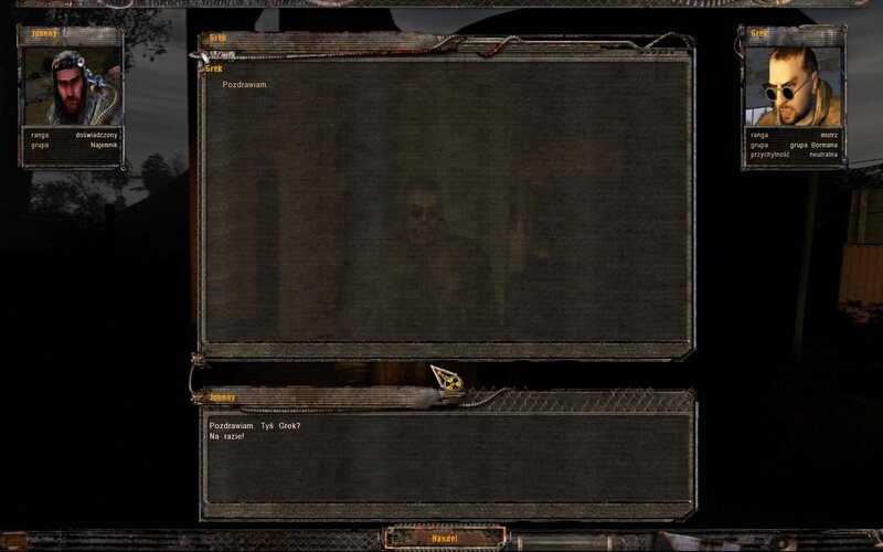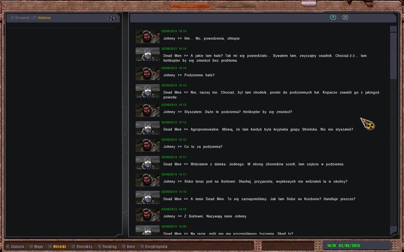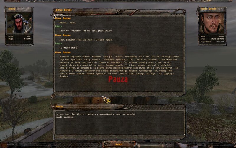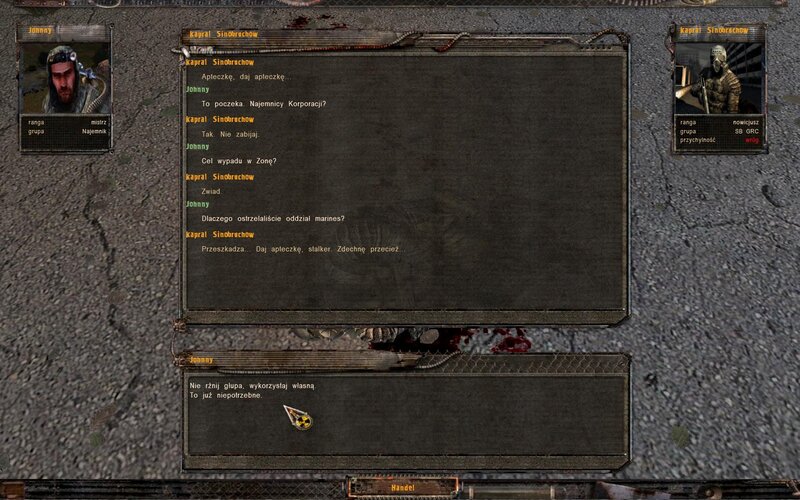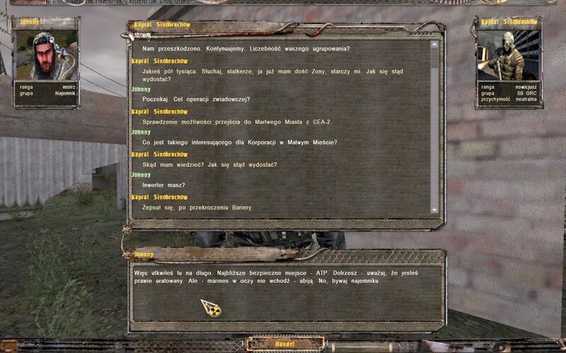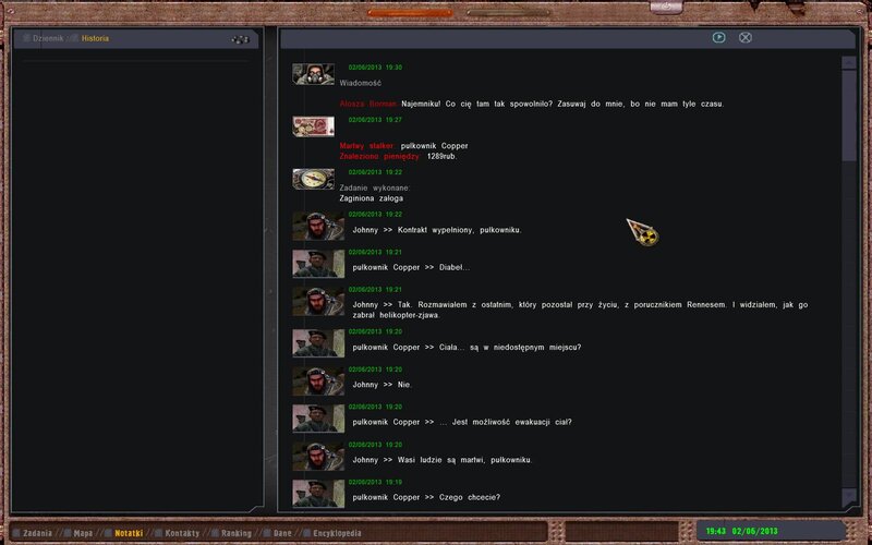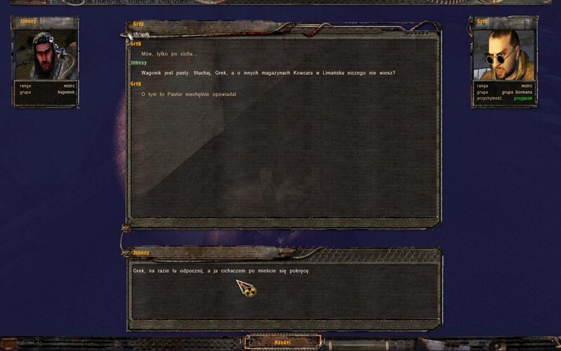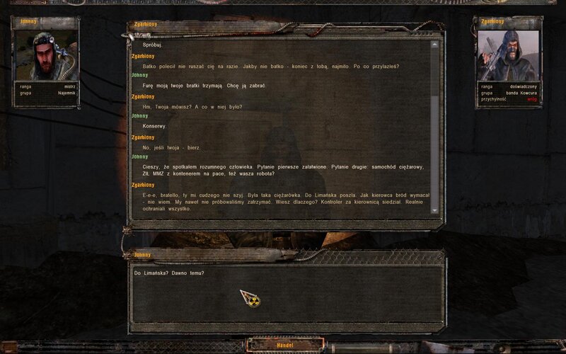 Rozmawiamy z Bormanem - dostajemy zadanie na likwidację arsenału najemników. Idziemy do Greka - tu mamy wybór - możemy nie atakować z nim Kowcura. Ja się zgodziłem. Walimy bandytów i przesłuchujemy Kowcura - tajemnicze skrzynki są w Limańsku. Koło siedziby bandytów znajdujemy dziwne ulotki. Przychodzi wiadomość, że mamy gdzieś na razie się przyczaić. Idziemy na ten czas z Grekiem do Limańska.