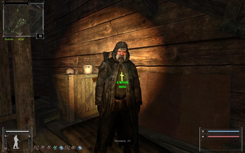Na Kordonie spotykamy Szatana. To przewodnik. Prowadzi nas na Bagna. Tam rozmawiamy z ojcem Onufrym. Z dialogu wynika że, o. Witalij może być w pobliskiej bazie braciaków. Korzystamy ponownie z usług Szatana. W bazie spotykamy Murzyna. On mówi nam, że Witalij był ale poszedł na Wiedźminie Bagno. Prosimy o przewodzenie naszego rozmówcę. Witalija znajdujemy - trzeba dobrze przygotować się do rozmowy z nim - dialog musi być szybki (apteczki się przydadzą - będzie do nas strzelał). Ranimy ojczulka w stopę - uspokaja się. Ak zabieramy (zostawiamy przy schodach). Po odejściu kilku metrów dostajemy sms od Witalija. Rozmawiamy - on odsyła nas do Gigera w Starej Wsi. Po rozmowie z ojczulkiem zabieramy z gleby AK - mając go w inwentarzu w czasie rozmowy utracilibyśmy go - a tak mamy dobrą pukawkę. Idziemy Do Wsi.