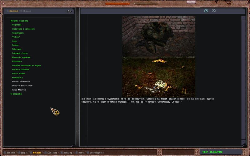 Po rozmowie ze Stepwem wychodząc z budynku dostajemy sms od Zlaticza. Bierzemy zadanie na piekielnego pieska. Spotykamy się z naszym oddziałem. Ruszamy ubić kreaturę. Używamy noża - roazprawa jest dość krótka. Odbieramy nagrodę. Idziemy do Hugo, Przechodząc przez Bar oglądamy jak Ripley zabija za jednym zamachem 7 bandytów jak kontroler - faktycznie nie jest człowiekiem. Na miejscu gdzie stała Ripley znajdujemy notatkę - zaproszenie. (info od Apg2312 - ja do biolabu poszedłem instynktownie - nie zauważyłem za pierwszym razem notatki zajęty rabowaniem trupów)