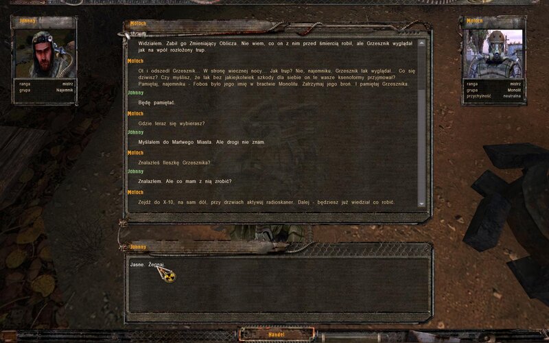 Na Magazynach Wojskowych spotykamy Molocha. Pomagamy mu zlikwidować bandytów Kowcura. Jeden mi przeżył - ale nic nie wiedział - ubiłem go. (chyba tak ma być bo był dialog z gadem) Moloch staje się nowym Grzesznikiem - oddajemy mu naszą “sztabę”. Idziemy na Radar - tam przy wejściu trzeba mieć Sztylet w pogotowiu - korporacja wita