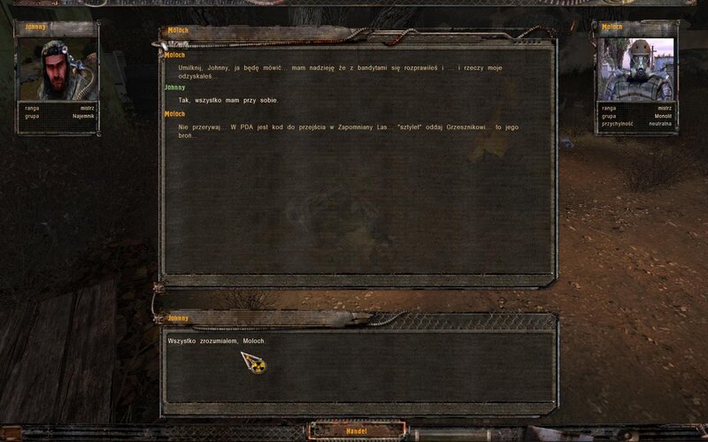 Poszedłem dalej po fabule. U Deimosa zdajemy zadanie i informuje nas on o tym, że Moloch czeka na nas w Czerwonym Lesie. Tam spotykamy ojczulków i rannego przewodnika. Znaleźli go na moście rannego. Idziemy porachować kości frajerom. Zachodzimy do szefa i wtedy dostajemy sygnał o bandzie. Czekamy aż przejdą most - Sztylet ma tendencję do wpadania do wody - a wtedy lipa. Zbieramy z ciał PDA Zachara - w nim jest o Kutwie, PDA Molocha i Sztylet. Wracamy do obozu ojczulków.