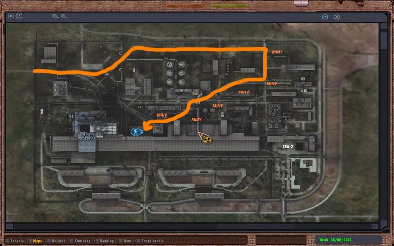 Spotykamy porucznika Chwostowa - zombi. Od niego dostajemy info o Zmieniającym Oblicza. Odnajdujemy ciężarówkę i rozmawiamy o układzie z żelazną gębą. Musimy teraz znaleźć sposób na ewakuacje z MM. W PDA mamy podpowiedź - wbrew pozorom nie jest tak pusto jakby się wydawało. Szukamy na obrzeżach miasta. Wybijamy Korporacyjnych przeciwników - przy jednym z ciał jest PDA (zaznaczyłem na screenie). Mamy punkt gdzie jest przejście na CEA. Jedziemy autem. Po pojawianiu się na elektrowni dostajemy info od Hugo. Jedziemy na miejsce ewakuacji.