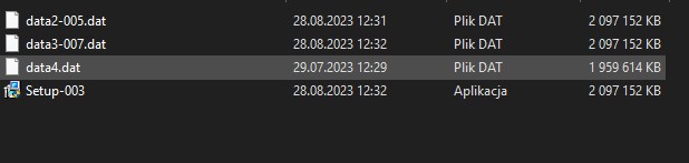 Weź może skasuj z nazw te dopiski 005 i 007 bo ich nie powinno w ogóle tam być chyba, że przeglądarka Ci coś źle pobrała, albo Twój system jakimś cudem nadaje im takie nazwy… Potem spróbuj odpalić instalator i zobacz czy wtedy się zainstaluje - z usuniętymi dopiskami 005 i 007 czy nie, bo patrząc na zrzuty z poprzedniej strony to podczas instalacji instalator chyba poprosił Cię o włożenie dysku nr.2 gdzie nie powinien w ogóle o coś takiego prosić tylko teraz pozostaje kwestia czy problem powoduje zła nazwa plików, czy coś Ci się po prostu źle pobrało z Google Drive (zgaduję tylko oczywiście, że może chodzić o złą nazwę lub coś się źle pobrało, ale z krzaczków w instalatorze widziałem symbol “#2” na Twoich zrzutach co mi zasugerowało, że instalatorowi może chodzić o dysk nr.2, który w tym przypadku jest archiwum nr.2 czyli data2 lub data3 - kilkanaście lat temu jak byłem młodszy to zazwyczaj jak się przeglądało to co zawiera dysk CD czy DVD z grą to zawierał właśnie kilka plików o rozszerzeniu .dat i do tego był plik .exe instalki i to wszystko stąd skojarzyłem, ale mogę się oczywiście mylić).