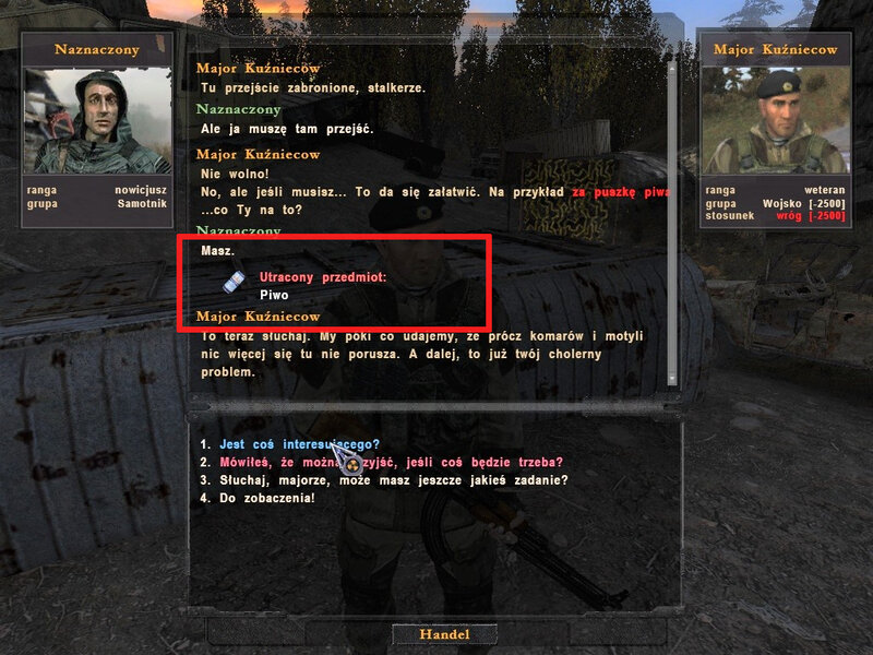 Męczy Was ciągłe „płacenie wódką” za przejście pod mostem w Kordonie? A może macie ochotę napuścić hordę głodnych mutantów na Garika w Barze?..to małe ulepszenie (nie bójmy się słowa cheat) pozwoli „wykiwać” w/w postacie - zamiast wódki i antyradów zapłacimy im znacznie tańszym piwem.