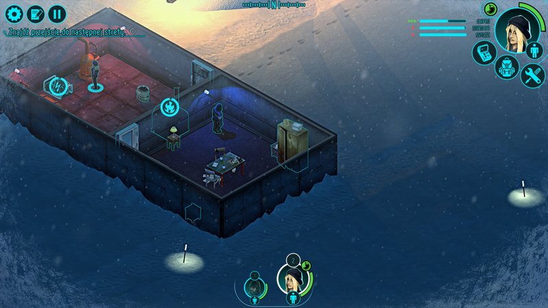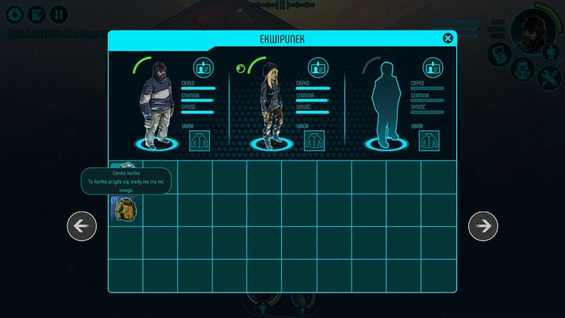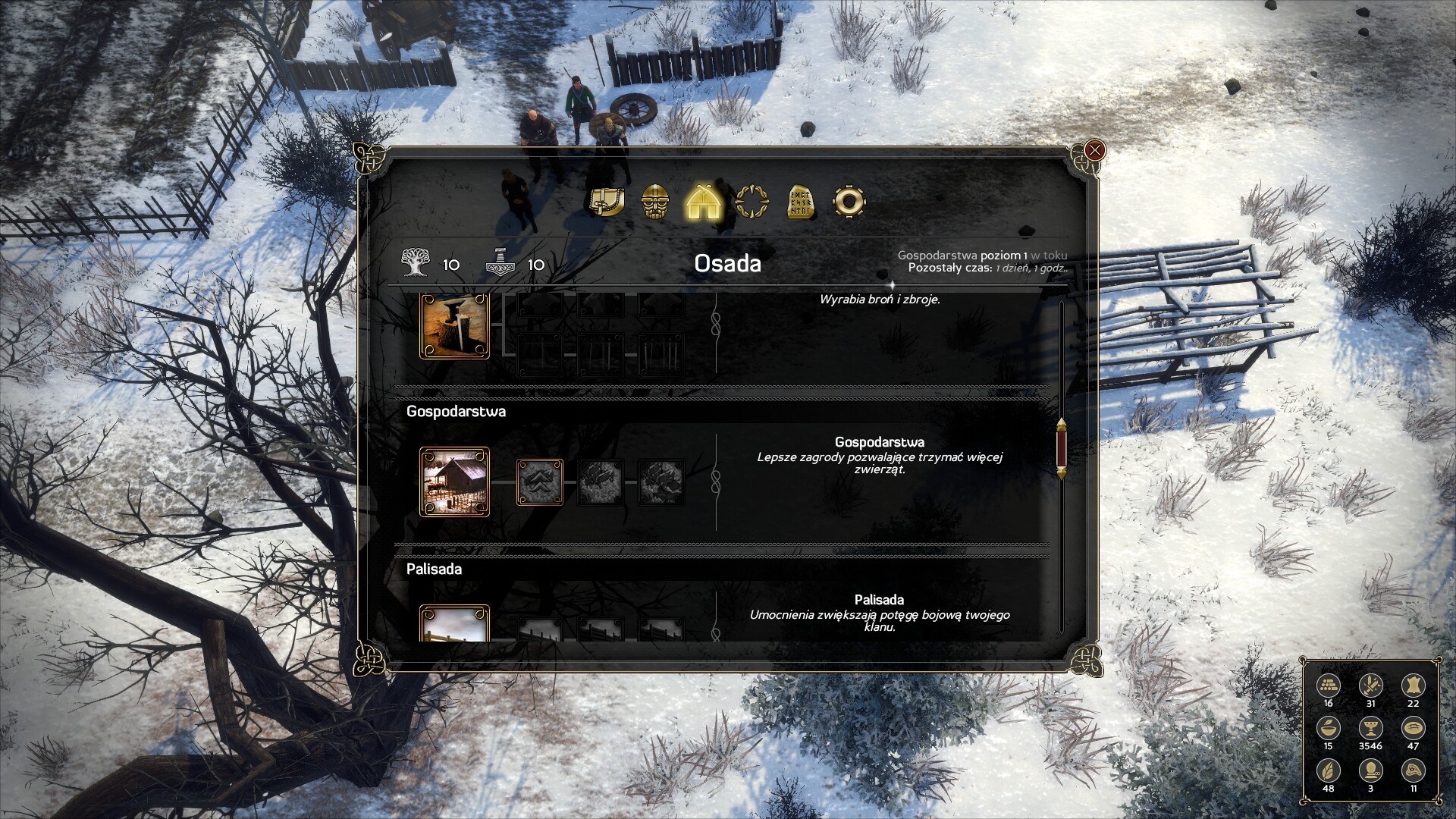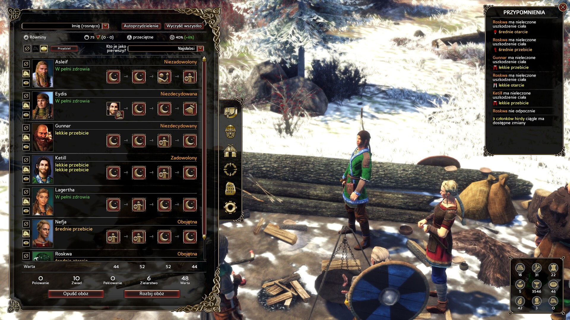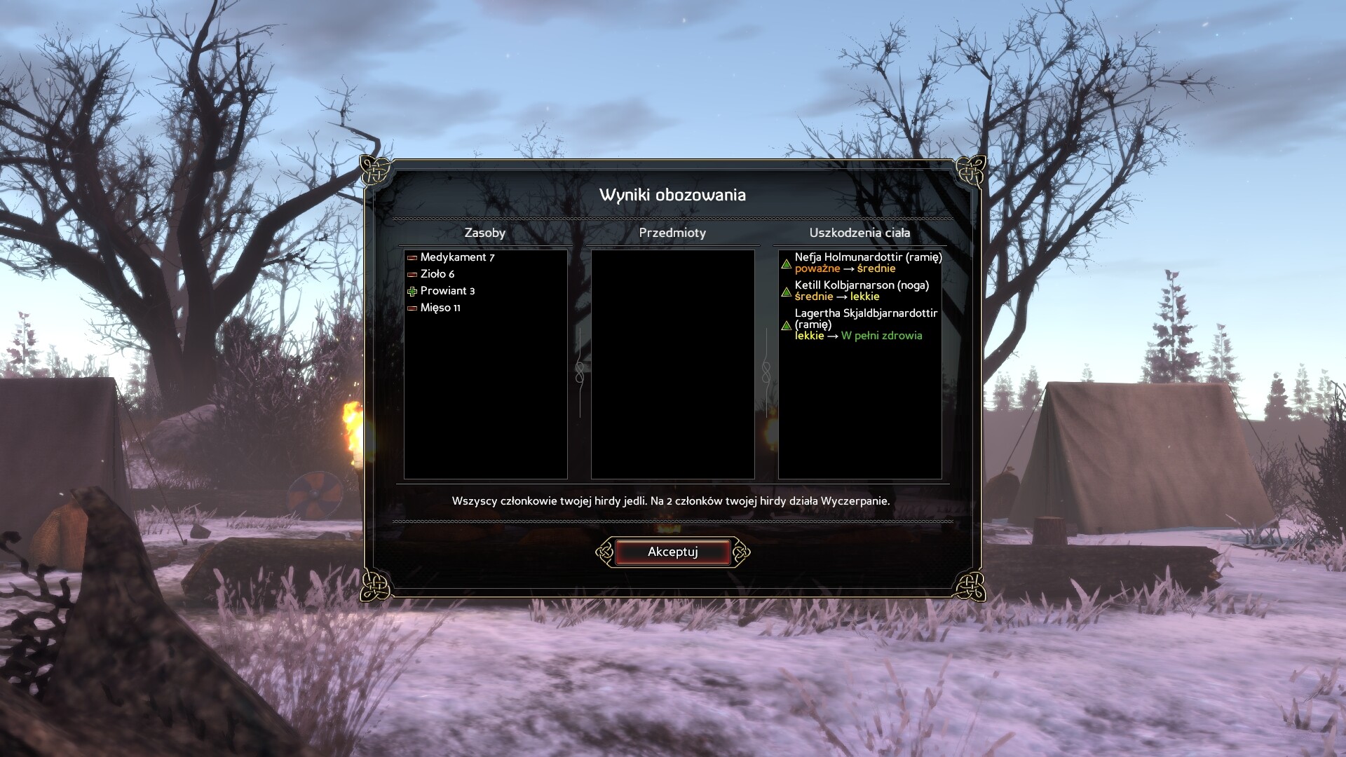 Okno obozowiska gdzie przydzielamy rzeczy do zrobienia. Po prawej przypomnienie co komu dolega. Na dole po prawej okienko z “surowcami”, zioła, jedzenie, mięso, kosztowności, medykamenty itp.
