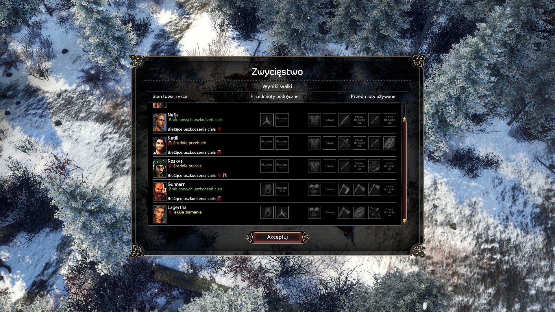 Statystyki po bitwie, widać kto oberwał i jak mocno. wyposażenie nieuszkodzone. Roskwa (szamanka) ma średnie otarcie krocza