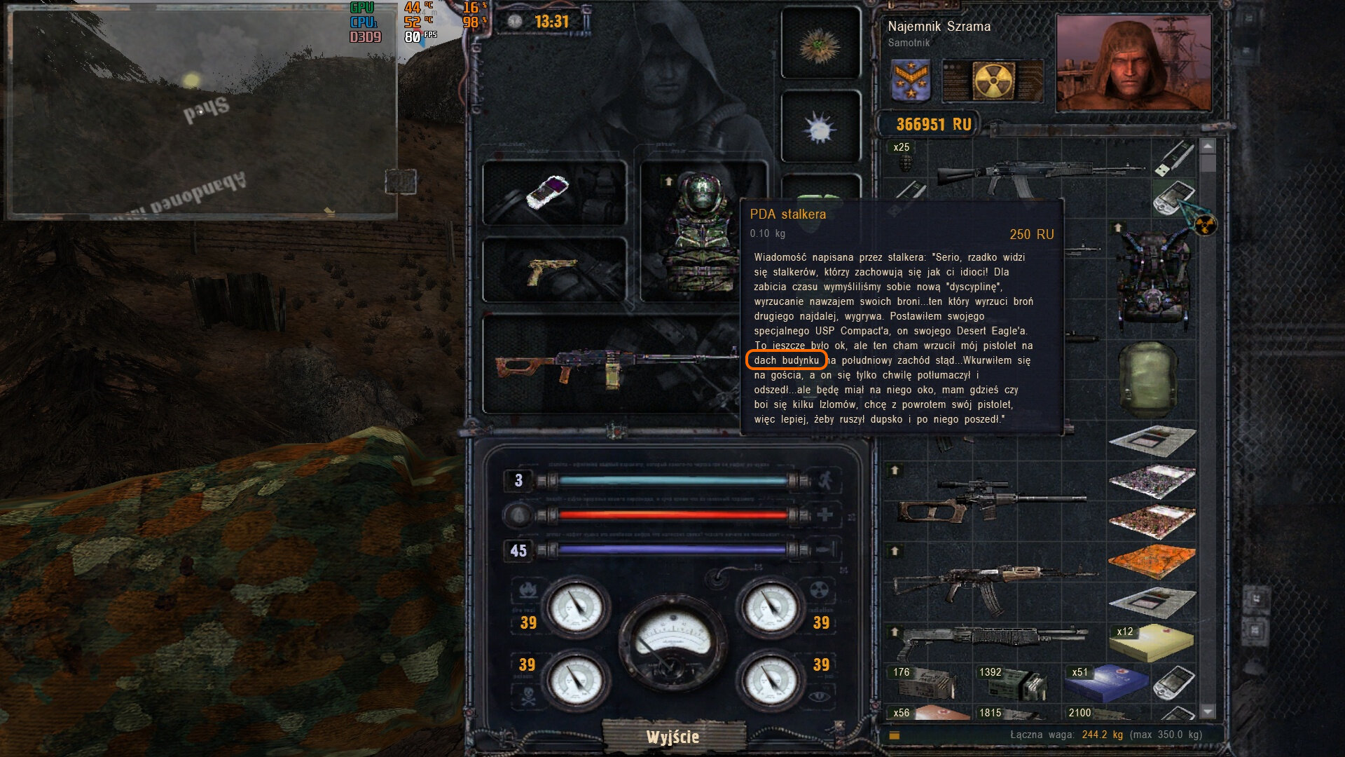Taaa… Z tą wieżą strażniczą to się skapnęliśmy z dopiero po wydaniu spolszczenia kiedy ja się czystym przypadkiem natknąłem na te dokumenty w ów wieży Czyli rozumiem, że skończyłeś moda? Jeśli tak no to na podstawie tych screenów, które wstawiłeś postaram się sklecić jakiś patch do spolszczenia Podziwiam za przeprawę przez Limańsk bez wywalenia nowych efektów wizualnych(mam na myśli bąble przestrzenne) bo u mnie klatki umarły w tym momencie Tak samo na CEA