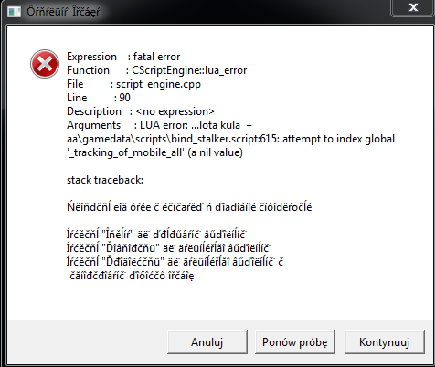 takie coś wywaliło mi wczoraj jak wpadłem w tą ruchomą anomalię na Wysypisku - log wskazuje na bind_stalker, ale bind_stalker jest zmodyfikowany tylko w miejscach gdzie musi być polski tekst i to jest oryginalny rosyjski plik z ZK+AA 2.1 tylko zmieniłem tekst tam gdzie było trzeba z ruskiego na polski (żeby ktoś nie pomyślał, że wziąłem z oryginalnego spolszczenia i po prostu wkleiłem, a teraz narzekam na wyloty ).